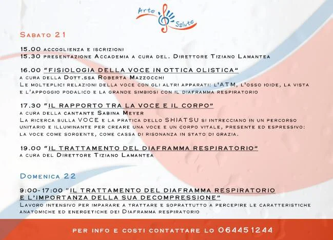 Debra Chiat, esperta insegnante di Yoga, e Sabina Meyer, soprano e artista internazionale, indagano insieme ai partecipanti la corrispondenza armoniosa tra i principi fondanti dello Yoga e del Canto per rintracciare e potenziare la gamma delle proprie risorse vitali, creative ed espressive. L‘attitudine della loro ricerca mira a “non fare”, “non volere”, “non produrre” un suono o un movimento, ma a predisporre mente e corpo per far emergere da solo il gesto vocale e corporeo, per trovare una presenza viva e palpitante. Il corpo, al contempo vigile e rilassato, diventa cassa di risonanza in stato di grazia.