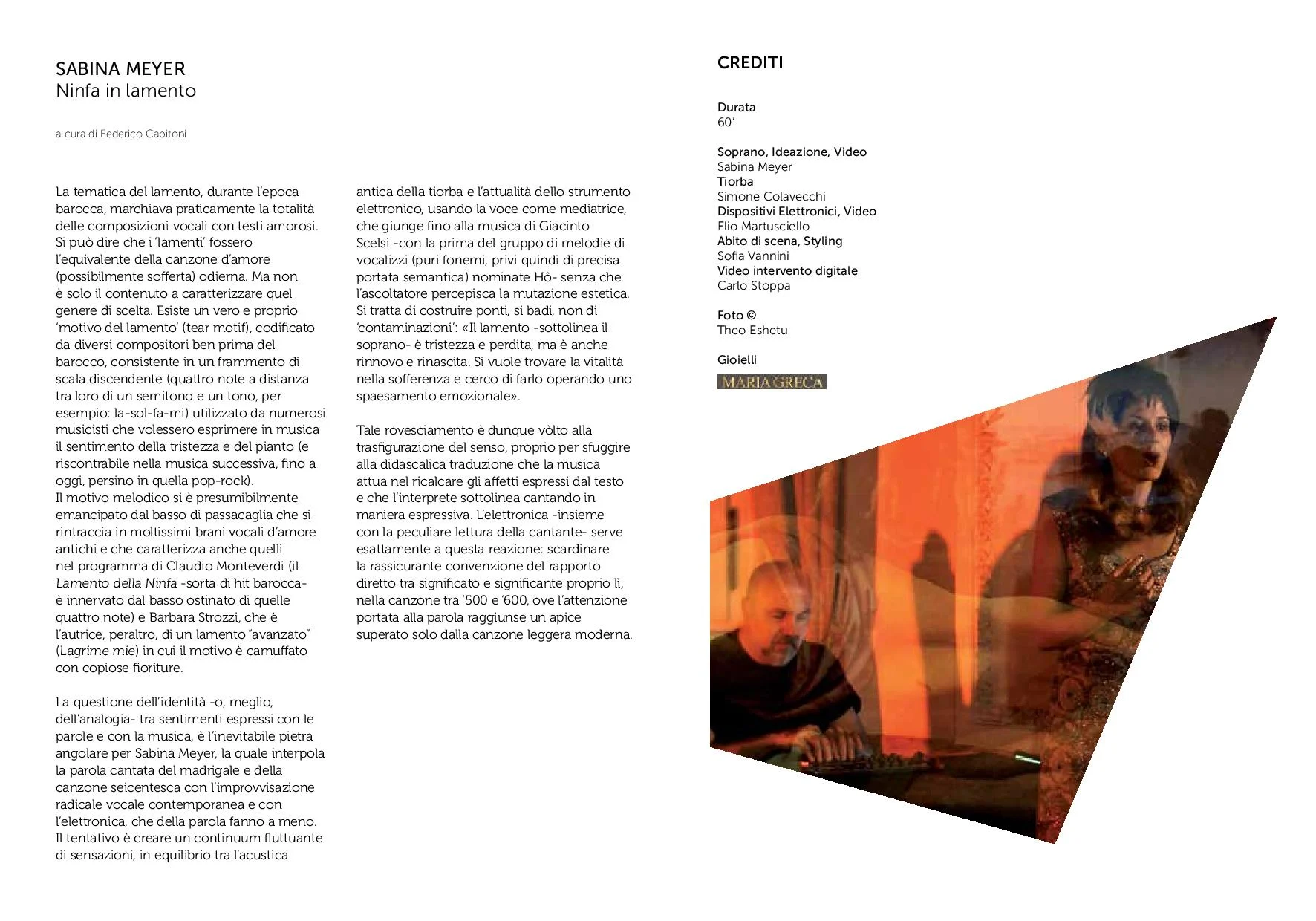 Da questo ricchissimo serbatoio Meyer ha attinto oltre che da Monteverdi, il celeberrimo “Lamento della ninfa”, anche da Barbara Strozzi e Girolamo Kapsberger con un tuffo nel Novecento di Scelsi. Nel concerto tuttavia i brani saranno presentati in una veste inconsueta, dove alla prassi musicale antica del soprano Meyer, accompagnata alla tiorba da Andreas Arend, navigato interprete di musica barocca ma anche compositore di musica contemporanea, si aggiunge il trattamento elettronico realizzato da Elio Martusciello, compositore e improvvisatore radicale.