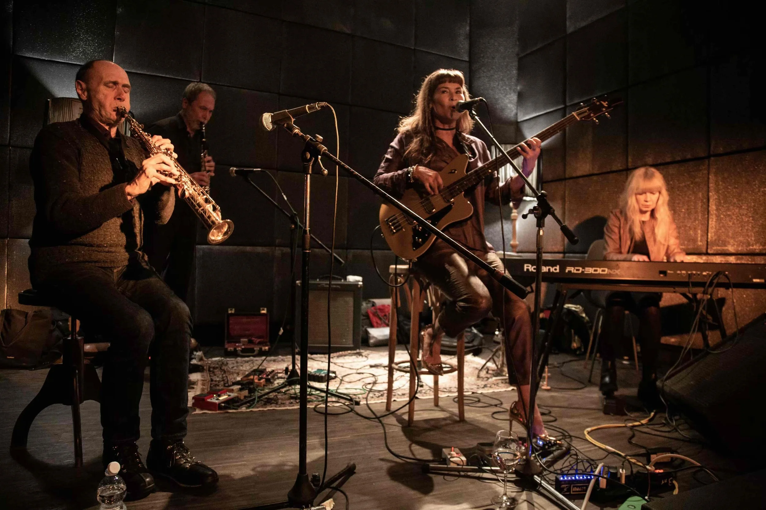 The dialogue between the four musicians who cross a wide range of expressive modes and very different musical paths - from classical music to rock, from baroque to radical improvistaion - are adressed and developed live in real time. An unusual musical ensemble—piano, clarinets, electric basses, and vocals— capable of creating an emotional climax that captures the audience's attention.